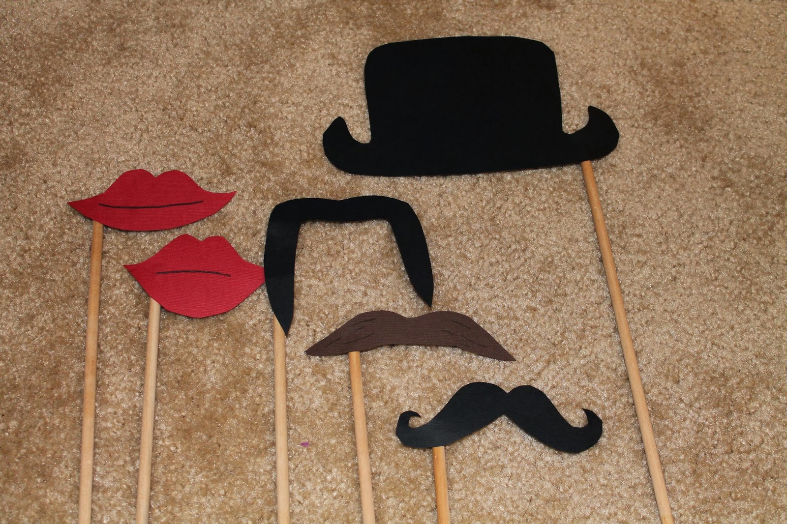 Now that I had the gadgets purchased, I moved my attention to the props and direction board. I purchased a few dowels and cut them down to size to create six prop holders. Then, I created my own assortment of mustaches, lips, and a top hat.
